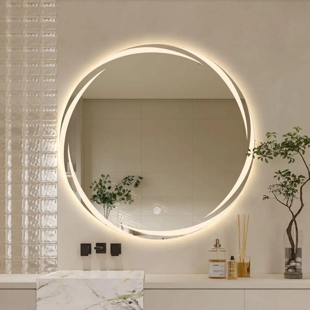 Miroir Halo LED tactile avec éclairage circulaire, verre haute qualité résistant à l’humidité et clarté d’image parfaite. Design moderne pour salle de bain.
