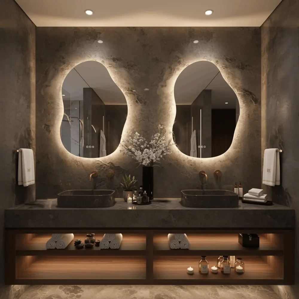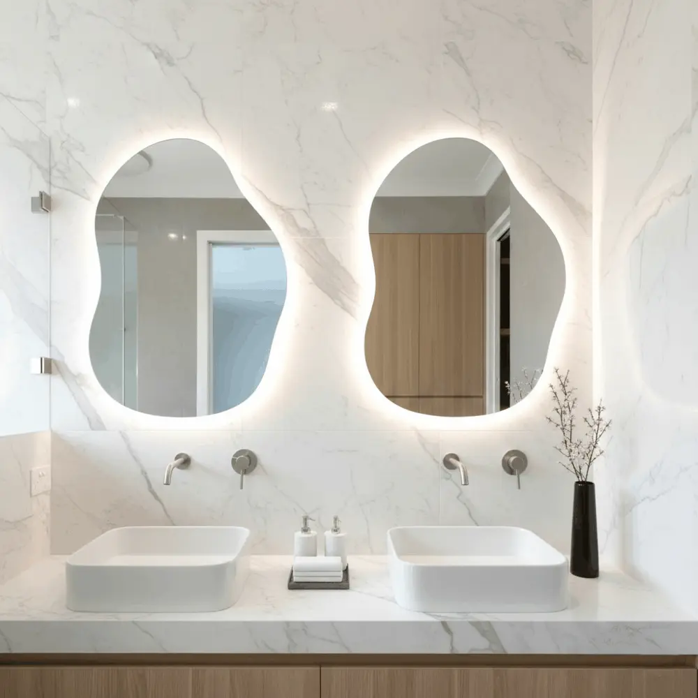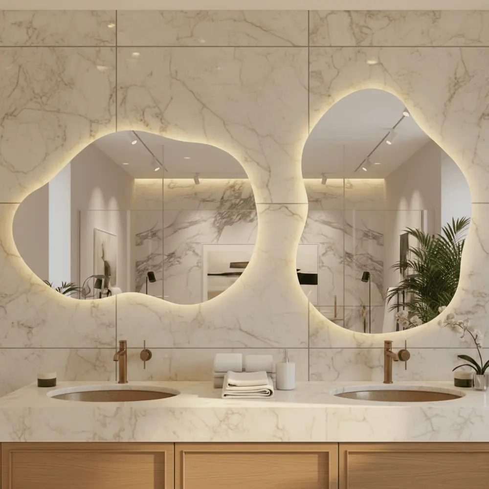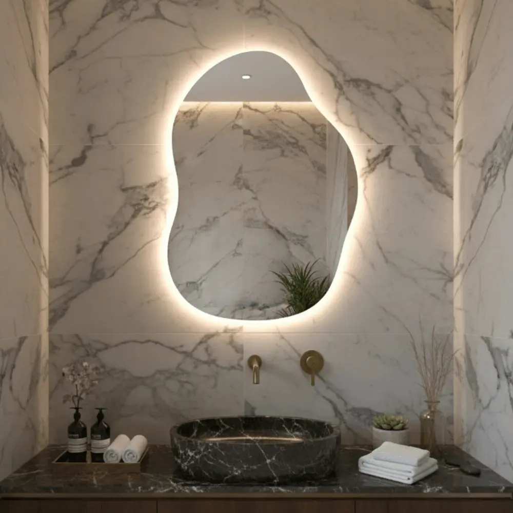 Miroir Reflex design irrégulier moderne, utilisable verticalement ou horizontalement, idéal pour salle de bain et décoration intérieure contemporaine. Finition premium et style élégant.